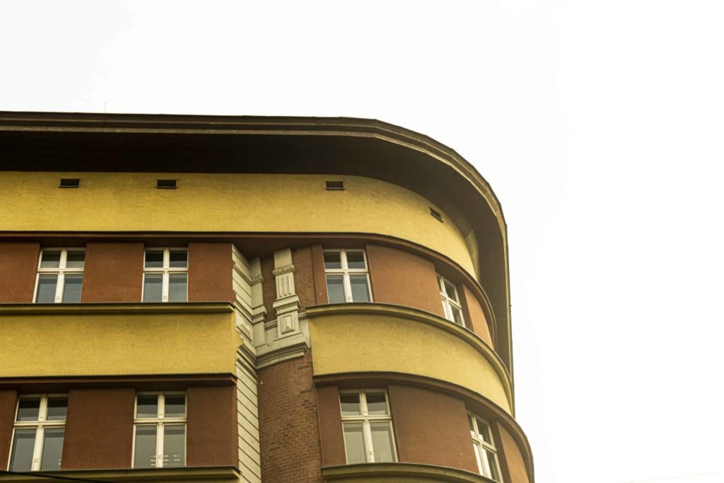 Irgendwas stimmt nicht mit diesem Gebäude. Es ist rot verputzt, mit vier horizontalen gelben Bändern über den Fenstern. Sieht ein bisschen aus wie eine Mischung aus Europahaus und den Wohngebäuden am Rosa-Luxemburg Platz. Erbauung Ende der 1920er Jahre, schätzungsweise. Aber, dann: ganz oben, blitzt heller Stuck hervor. Und in die schöne, abgerundete Ecke ist ein Spalt geschlagen, der sich vom obersten Stockwerk bis zum ersten Stock durchzieht.