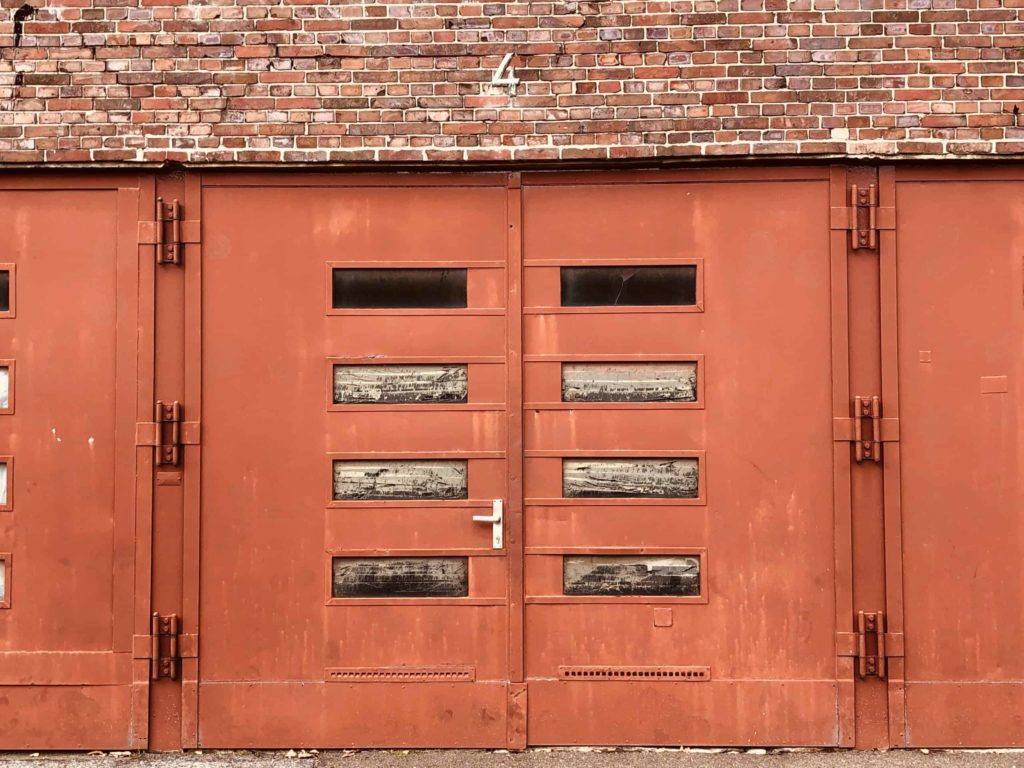 Die Garagen für Fahrzeuge und im Hintergrund die Wohnblöcke für Betriebsangehörige und ihre Familien @Zeitreisen Arne Krasting