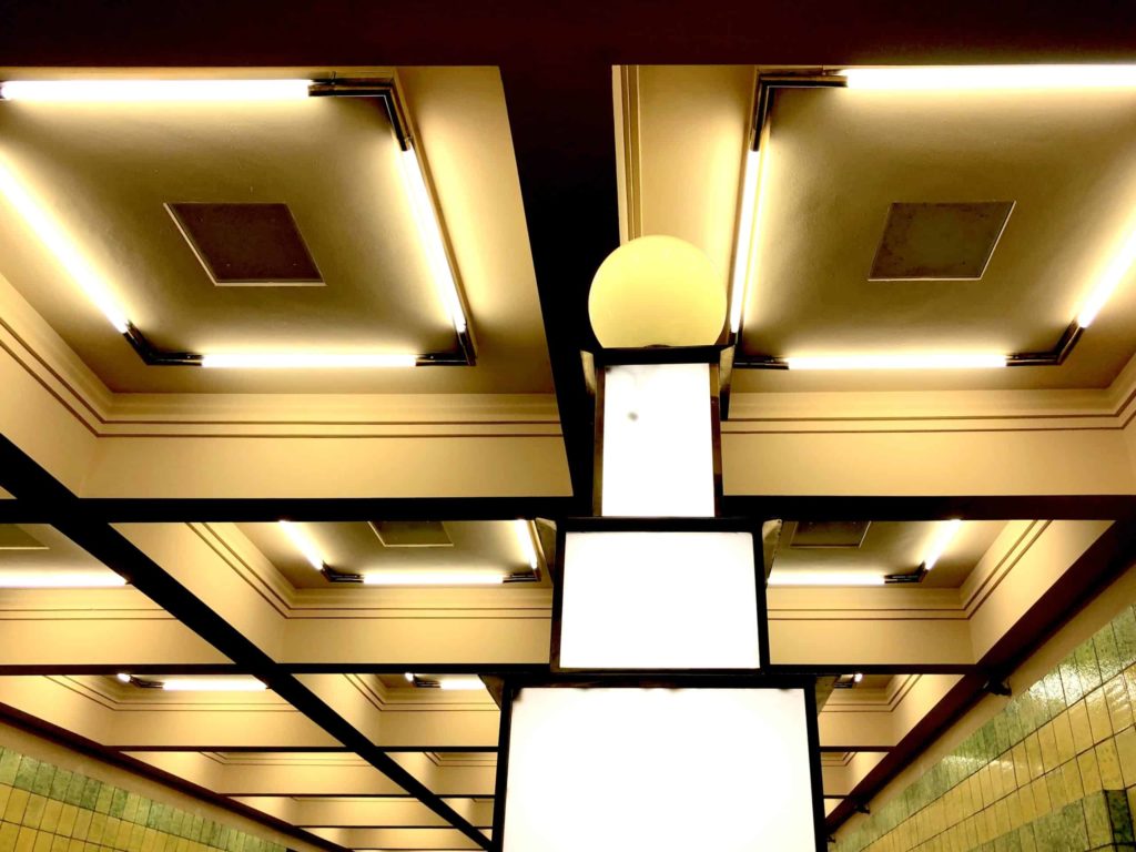 Aber dann überrascht das Innere des Gebäudes mit viel Farbe: Keramikfliesen, in gelb, grün, und blau. Die Eingangshalle verfügt über eine beeindruckende Kassettendecke und ein Bodenmosaik mit dem Berliner Bären und den Jahreszahlen von Baubeginn und Fertigstellung. Ein Hingucker ist auch die Kandelaber-Konstruktion an den seitlichen Treppenaufgänge: leuchtende, gestaffelten Türmen und eine aufgesetzte Kugellampe. Wie schön wäre es, wenn der Paternoster noch existieren würde!