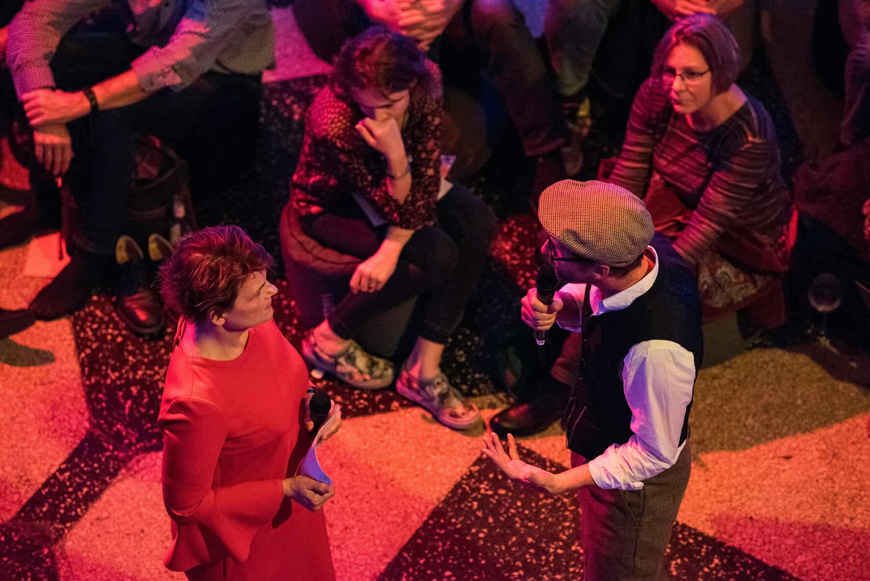 Starke Frauengestalten wie Claire Waldoff und Marlene Dietrich, die auch privat verbunden waren und durch die lesbischen Bars der Stadt zogen, stehen am Ende des Abends. „Raus mit den Männern aus dem Reichstag“, singt Claire Waldoff bzw. Gayle Tufts. Die Emanzipierung der Frau nach dem Ersten Weltkrieg und die Rolle der „neuen Frau“ ist dann auch Thema der letzten Gesprächsrunde.