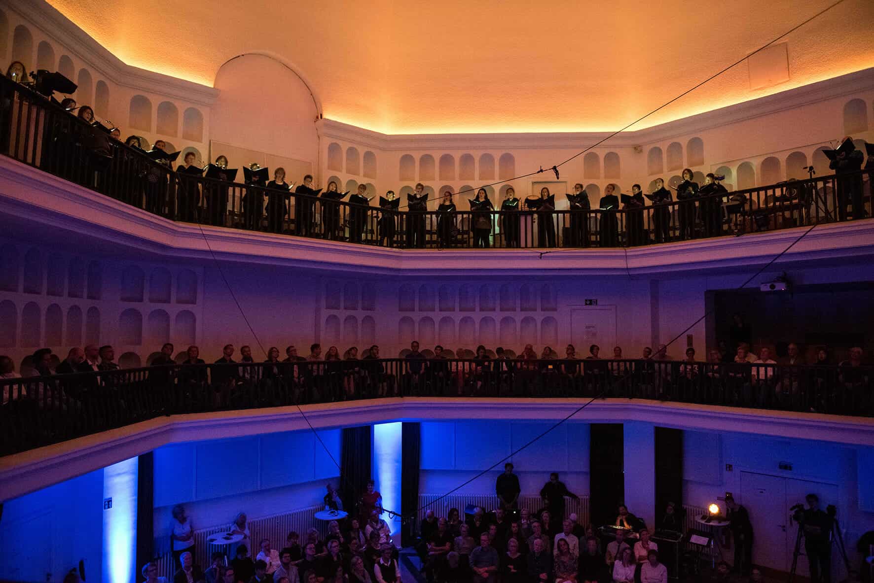 Früher wurden hier Leichen verbrannt. Wir sind in einem Krematorium, heute genutzt als Konzertlocation und bekannt unter dem Namen „Silent Green“. Um Tote geht es zunächst auch, als die Herren des Rundfunkchors traurig-schön von der Galerie des Krematoriums das Requiem von Herbert Howles anstimmen.