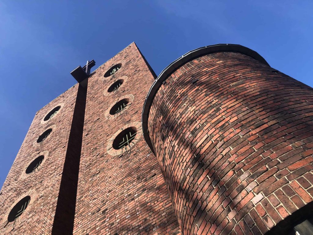 Ein markanter, blockartiger Turm, mit einem vertikalen Fensterschlitz und zwei zylindrischen Rundbauten davor, dann runde Fenster, wie Bullaugen: romanische Basilika und maritime Architektur kommen hier zusammen. Ein bisschen Chilehaus in Berlin. Übrigens: die Ziegelsteine für den Bau kommen von den Abrissgebäuden eines Platzes, der sich Ende der 20er Jahre anschickte, „Weltstadtplatz“ zu werden: der Alexanderplatz. Vielleicht sind Teile des alten Aschinger hier verbaut?
